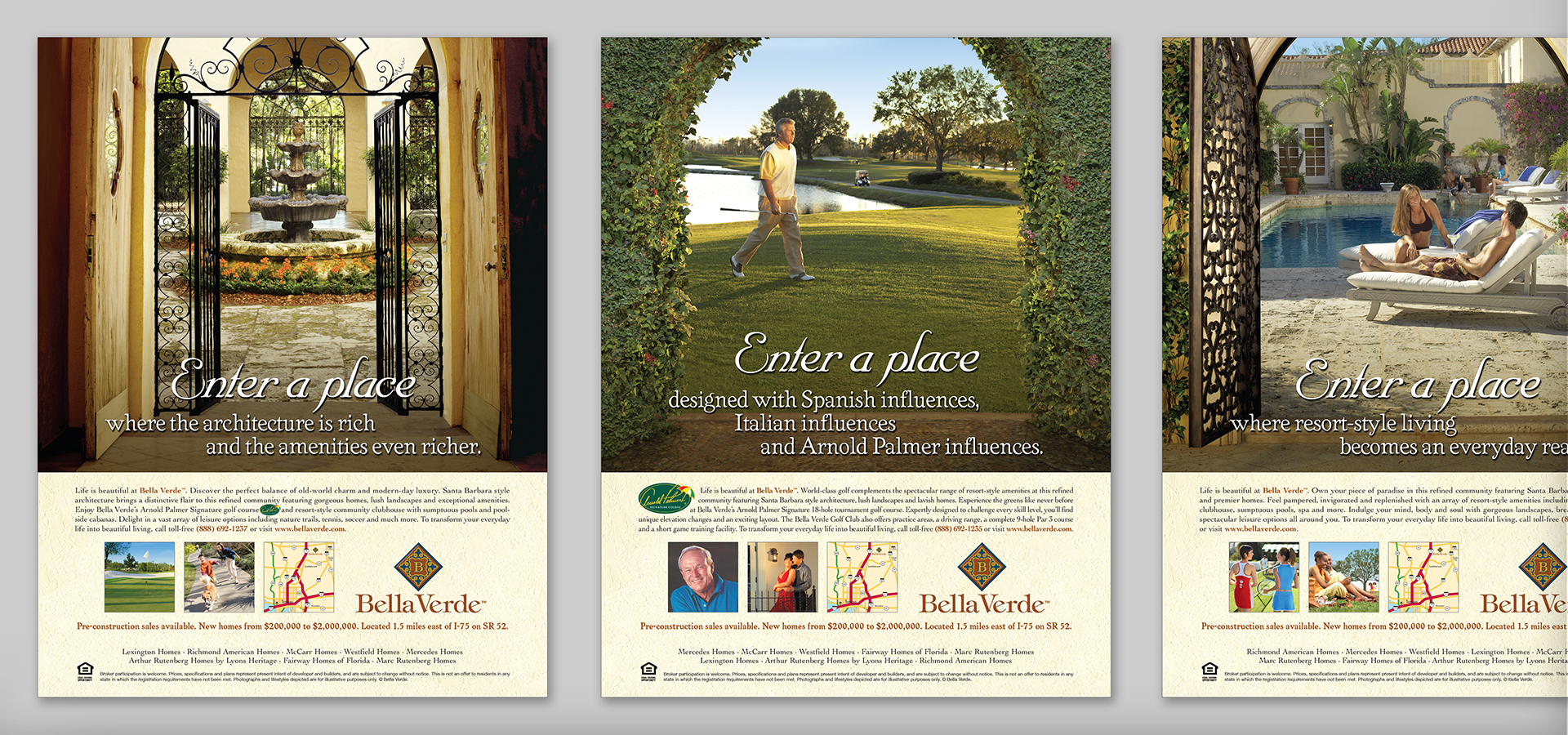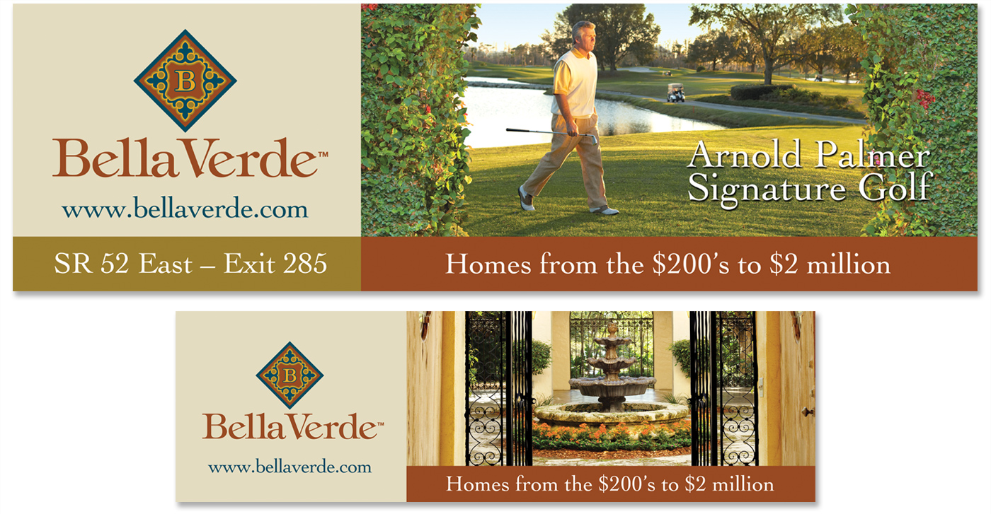 Planning a community from the ground up required a few basics—starting with an alluring community name and an engaging ad campaign to gather interest. With the Italian and Spanish architecture and a tournament golf course as main features, we created the name Bella Verde (Italian for “beautiful” and Spanish for “green” respectively). The campaign visuals were based on a theme of entering into a world and lifestyle that is breathtakingly beautiful, and relied on custom photography to showcase the inviting, upscale nature of the community.